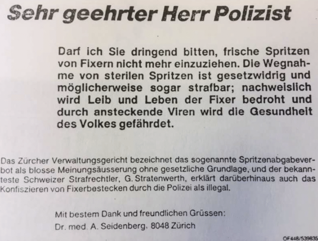 Darin habe ich die Polizei darauf aufmerksam gemacht, dass sie sich strafbar machen als Person wenn sie Substanzgebrauchenden die Utensilien wegnehmen, wo doch bekannt ist, dass in dieser Situation eine grosse Gefahr besteht, eine tödliche Krankheit zu akquirieren. Das hat dazu geführt, dass die polizeiliche Weisung noch am selben Tag zurückgenommen wurde. Ich hatte aber schon vorher der Polizeiführung geschrieben, dass ich Klage einreichen werde und fand ich mache das jetzt publik. Ab diesem Tag wurden die Spritzen nicht mehr eingezogen. Nun musste aber eine Spritzenabgabe organisiert werden. Es war nicht mehr möglich, die jetzt benötigten riesigen Mengen von Spritzen privat zu beschaffen. Der Staat musste einspringen und diese Aufgabe übernehmen. Zu diesem Zweck wurde von Peter Grob und Werner Fuchs der Verein ZippAids gegründet.